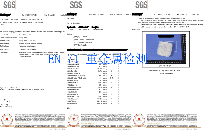 國際標(biāo)準(zhǔn)SGS實(shí)驗(yàn)室也對(duì)YIMA膠針系列產(chǎn)品做了多項(xiàng)標(biāo)準(zhǔn)檢測:其中EN71-3是歐盟玩具有關(guān)有毒金屬含量的檢測;European council directive 是94/62/EC包材類指令檢測;